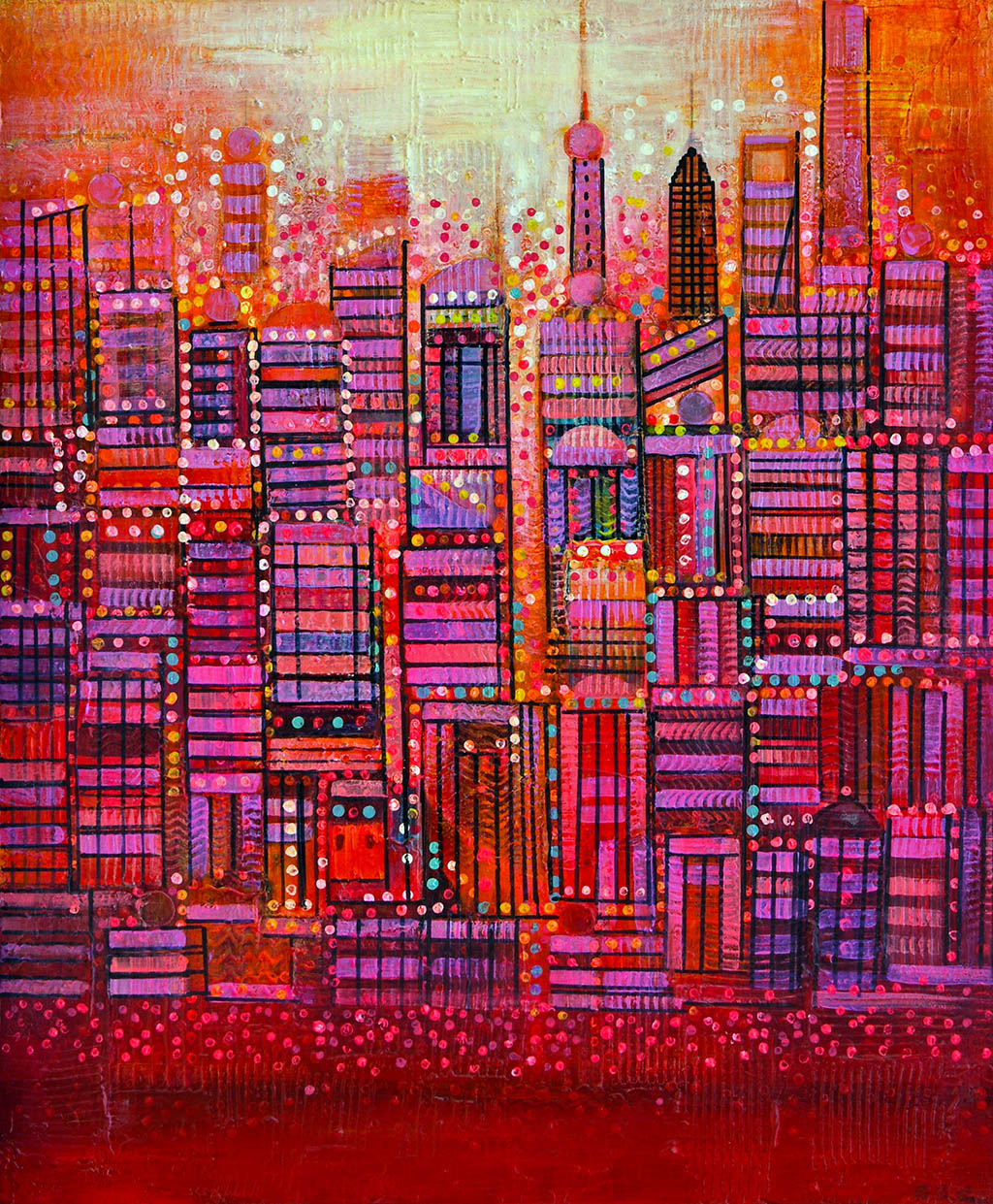 This vibrant cityscape bursts with geometric rhythm, capturing the pulse of urban life through stylized towers, domes, and spires. The warm gradient from yellow to deep red infuses the skyline with a sense of sunrise or sunset, suggesting both awakening and closure. Dots scattered across the canvas add texture and movement, like lights flickering or energy radiating through the metropolis. The artist’s bold palette and abstract layering transform architecture into emotion, turning the city into a living, breathing entity.