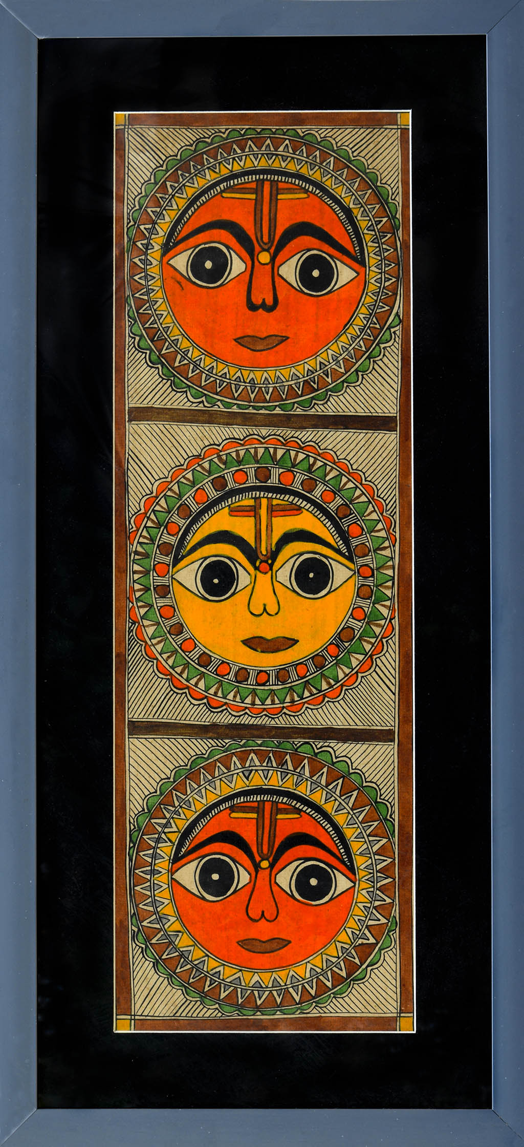 This folk-inspired painting features three radiant, circular faces stacked vertically, each adorned with symmetrical eyes, delicate tilaks, and sunburst-like halos. Rendered in orange, yellow, and red, the faces evoke celestial or divine presence, possibly symbolizing energy, transformation, and spiritual progression. The black background intensifies the vibrancy of the colors, while the blue-gray frame adds a…