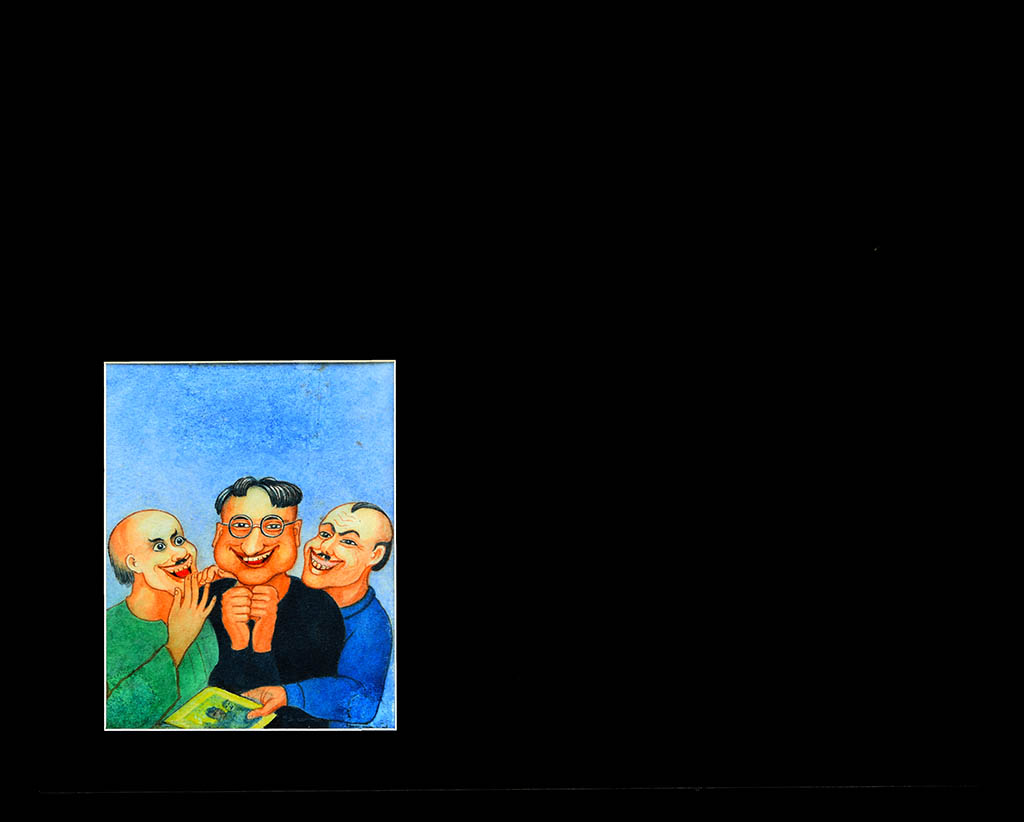 This lively illustration captures a moment of shared joy among three expressive figures, their exaggerated smiles radiating warmth and connection. The cartoonish style and vibrant blue background amplify the sense of playfulness and emotional spontaneity. One figure holds a book, hinting at storytelling or learning as a source of collective amusement. Through bold lines and cheerful energy, the artwork celebrates human interaction, laughter, and the simple beauty of togetherness.