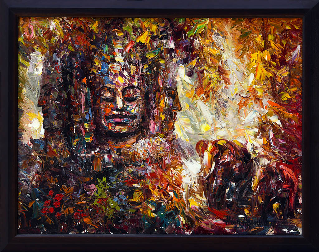 This vibrant oil painting centers a serene stone face—likely a deity or Buddha—bathed in swirling reds, purples, and golds that evoke spiritual radiance and inner calm. Flanking the figure are two elephants, rendered in expressive strokes, symbolizing wisdom, strength, and cultural reverence. The impasto technique adds texture and movement, making the foliage and light feel…