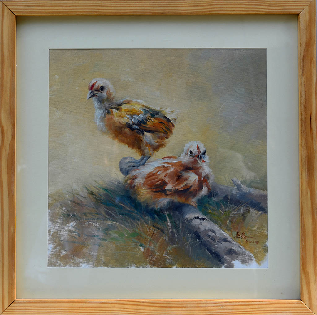 This intimate watercolour composition captures two juvenile chickens perched on a fallen tree branch, rendered with delicate brushwork and a keen sensitivity to texture and light. The upright bird, alert and poised, contrasts gently with its reclining companion, evoking a quiet moment of repose in nature. Feathers shimmer in warm tones of ochre, sienna, and soft white, layered with fine strokes that suggest both softness and vitality. The background—a muted wash of earthy hues—offers atmospheric depth without distraction, allowing the subjects to emerge with quiet clarity. The artist’s signature in red, accompanied by the year, anchors the work in time while preserving its timeless pastoral charm.