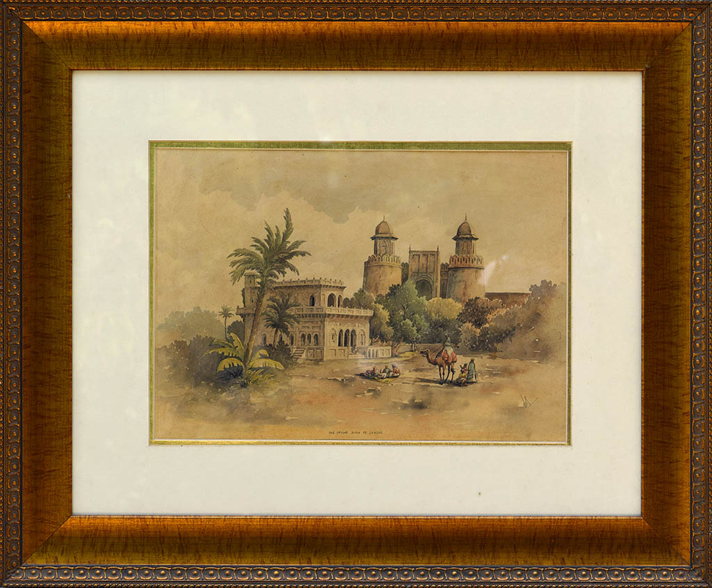 This architectural painting titled The Palace and the Gate captures a regal complex with domed towers, arched balconies, and lush greenery, evoking historical grandeur. Figures and a camel in the foreground add life and scale, suggesting a moment from daily courtly life or travel. The composition balances ornate detail with atmospheric depth, inviting reflection on heritage, movement, and spatial memory. Its warm palette and intricate framing echo the elegance of South Asian or Middle Eastern visual traditions, blending narrative and nostalgia.