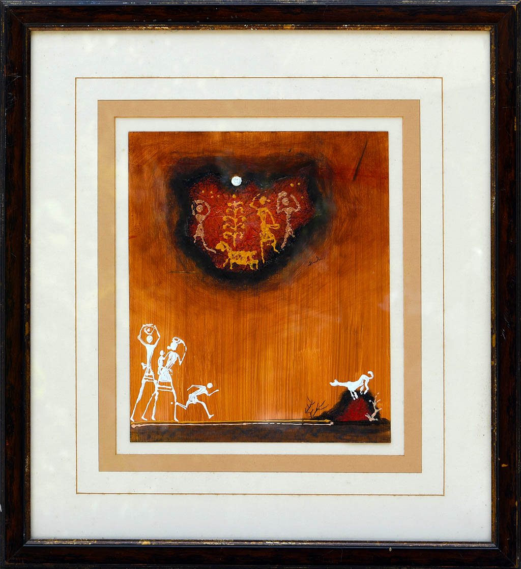 This evocative artwork blends tribal and mythological motifs, where yellow and red figures dance beneath a white moon-like circle on a textured, reddish-brown canvas. The dark central shape suggests a cave or sacred space, anchoring the ritual energy of the scene. Below, white line drawings of humans, animals, and birds unfold like a visual folktale—depicting movement, companionship, and ancestral memory. The composition, rich in symbolic layering, transforms traditional storytelling into a contemporary meditation on heritage, journey, and belonging.