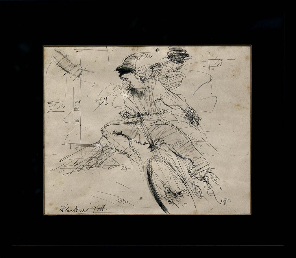 This expressive ink sketch captures a moment of shared motion, as two figures ride a bicycle with fluid, energetic lines. The loose strokes convey speed and spontaneity, turning a simple scene into a celebration of companionship and movement. The minimal background enhances the focus on gesture and connection between the riders. It’s a lively vignette—where…