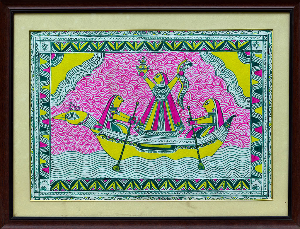 This Madhubani painting bursts with mythic vibrance, as four figures ride a stylized yellow bird across rhythmic blue waters. The central figure, adorned and commanding, evokes divine presence, while the others paddle in harmony, suggesting ritual journey or cosmic travel. A pink sky filled with patterned clouds and bordered by geometric motifs frames the scene with festive intricacy. It’s a celebration of folklore and devotion—where color, symmetry, and storytelling unite in sacred motion.