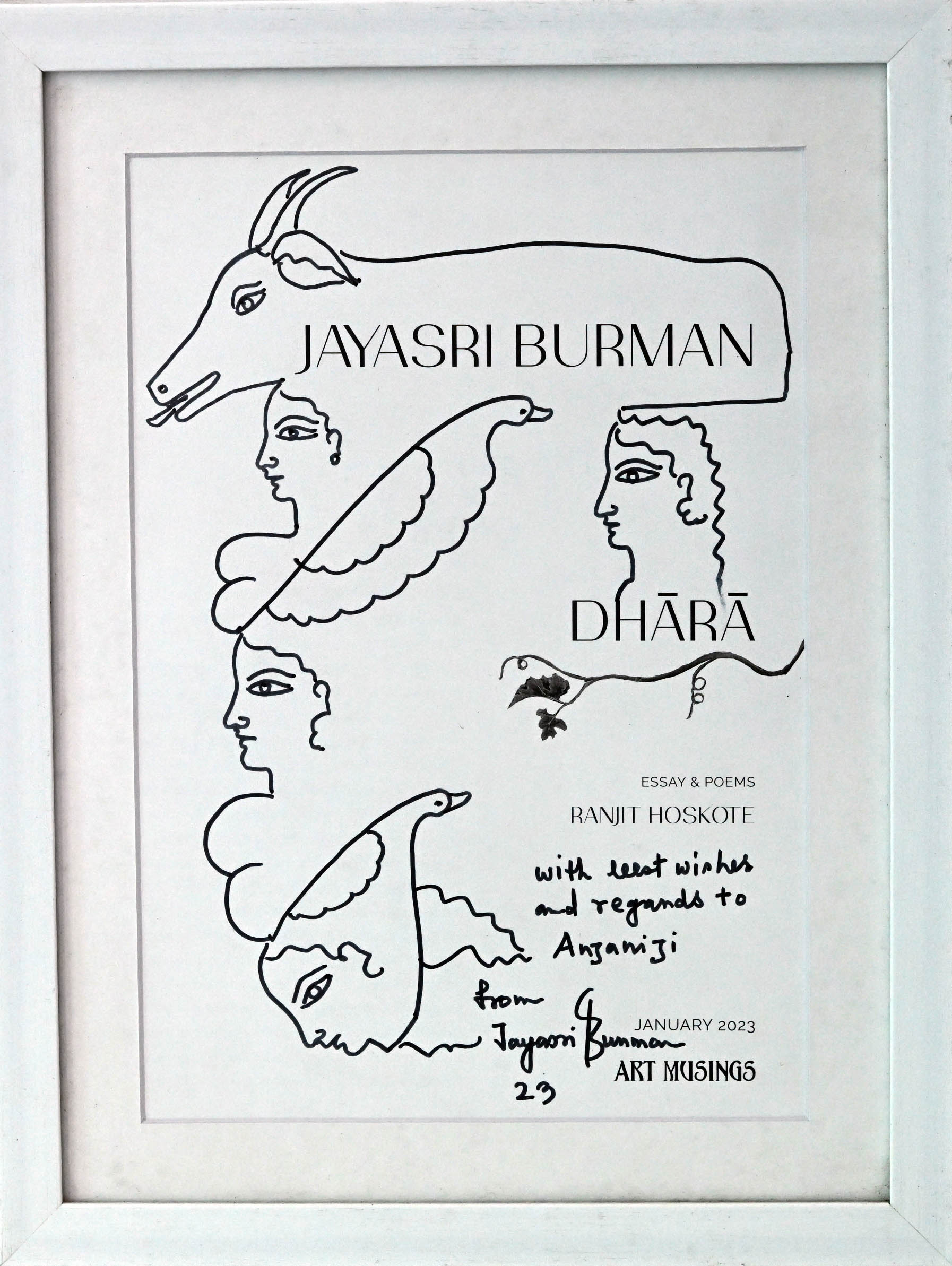 Jayasri Burman’s ink drawing unfolds like a lyrical offering, where stylized faces, animals, and feathers weave together in quiet symbolism. Each line is deliberate yet fluid, evoking myth, nature, and introspection with minimalist grace. The handwritten dedication and poetic references deepen its intimacy, transforming the artwork into a personal blessing. It’s a visual invocation—where art,…