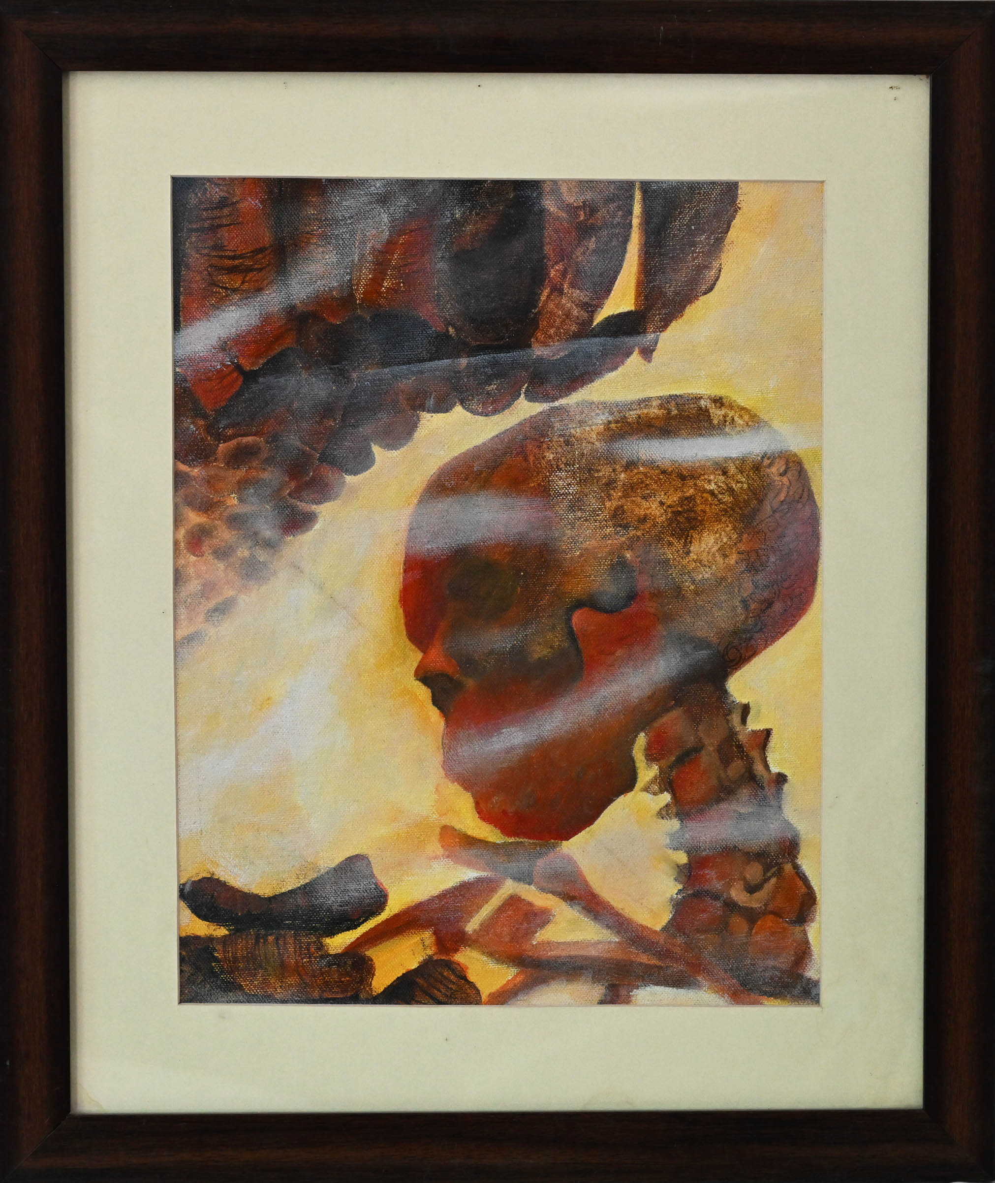 This surreal painting presents a haunting vision of a human skull and vertebrae, rendered in warm, fossil-like tones that evoke decay and transformation. Above the skull, dark feathered forms curve downward, adding motion and mystery to the otherwise still composition. The background’s pale gradient contrasts sharply with the textured anatomy, heightening the sense of isolation and introspection. It’s a meditation on mortality—where bone, shadow, and abstraction converge in quiet reverence.