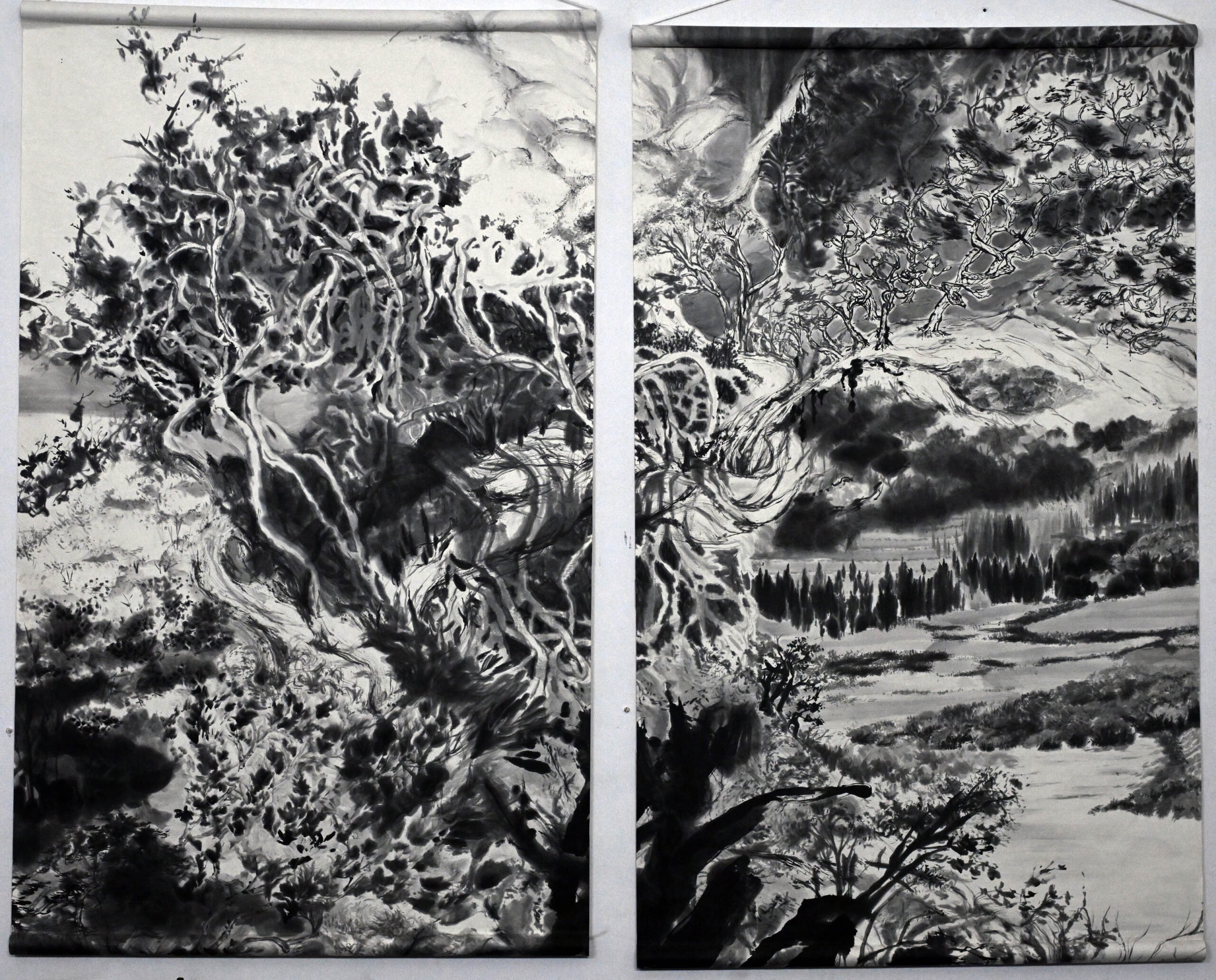 Twisted trees and swirling ink conjure a landscape alive with motion, mystery, and elemental force. The scrolls unfold a panoramic vision where mist, river, and forest blur into poetic abstraction. Each brushstroke balances precision and spontaneity, echoing East Asian traditions of capturing nature’s spirit rather than its form. This diptych becomes a meditative journey—inviting the viewer to wander through silence, shadow, and timeless breath.