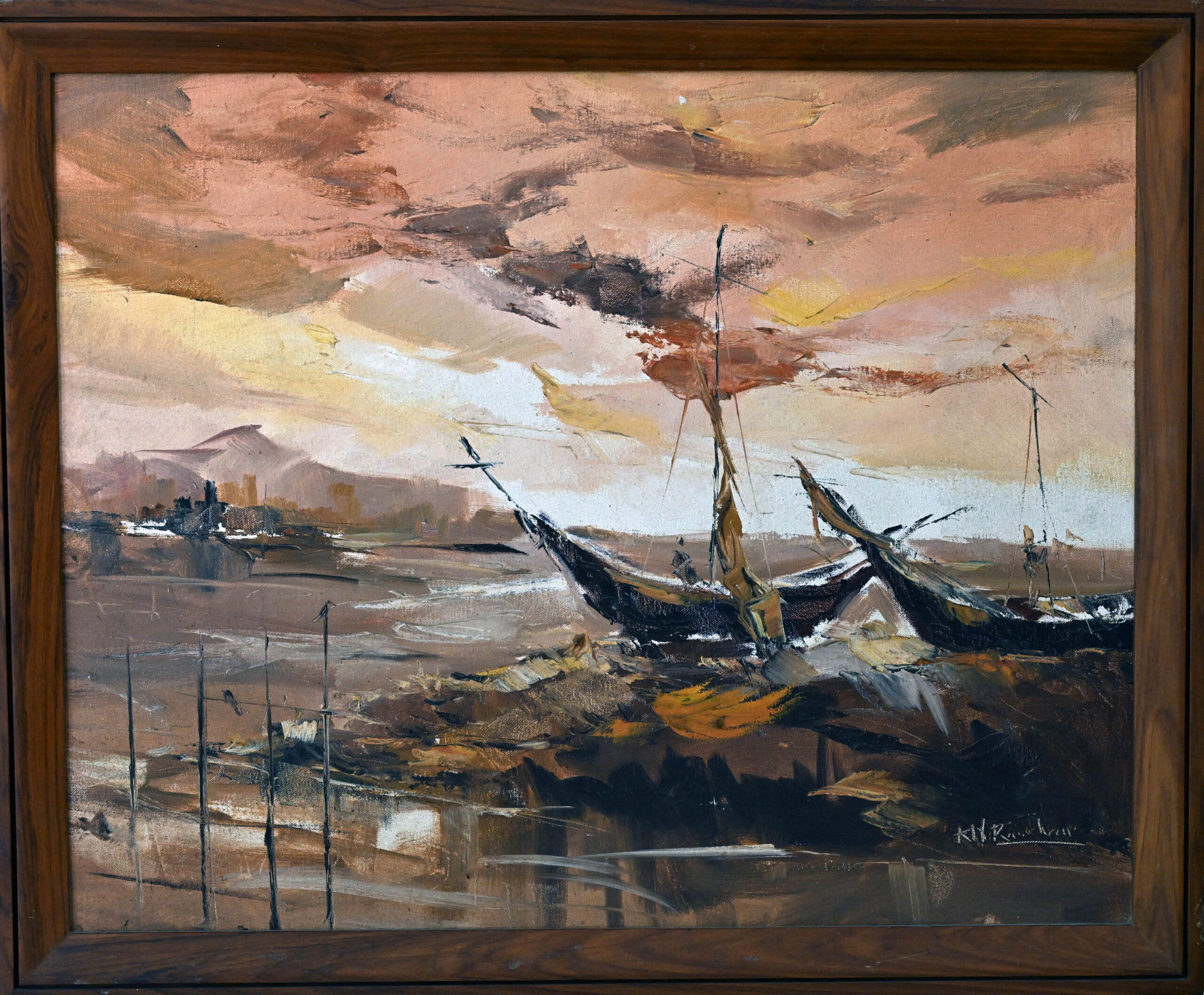 Three weathered boats rest quietly on a moody shore, their masts leaning like tired sentinels. Earthy tones of ochre and brown sweep across the canvas, evoking a sense of abandonment and memory. The textured brushwork and cloudy sky suggest a storm passed—or one yet to come. This maritime scene holds a melancholic stillness, where time and tide seem suspended.