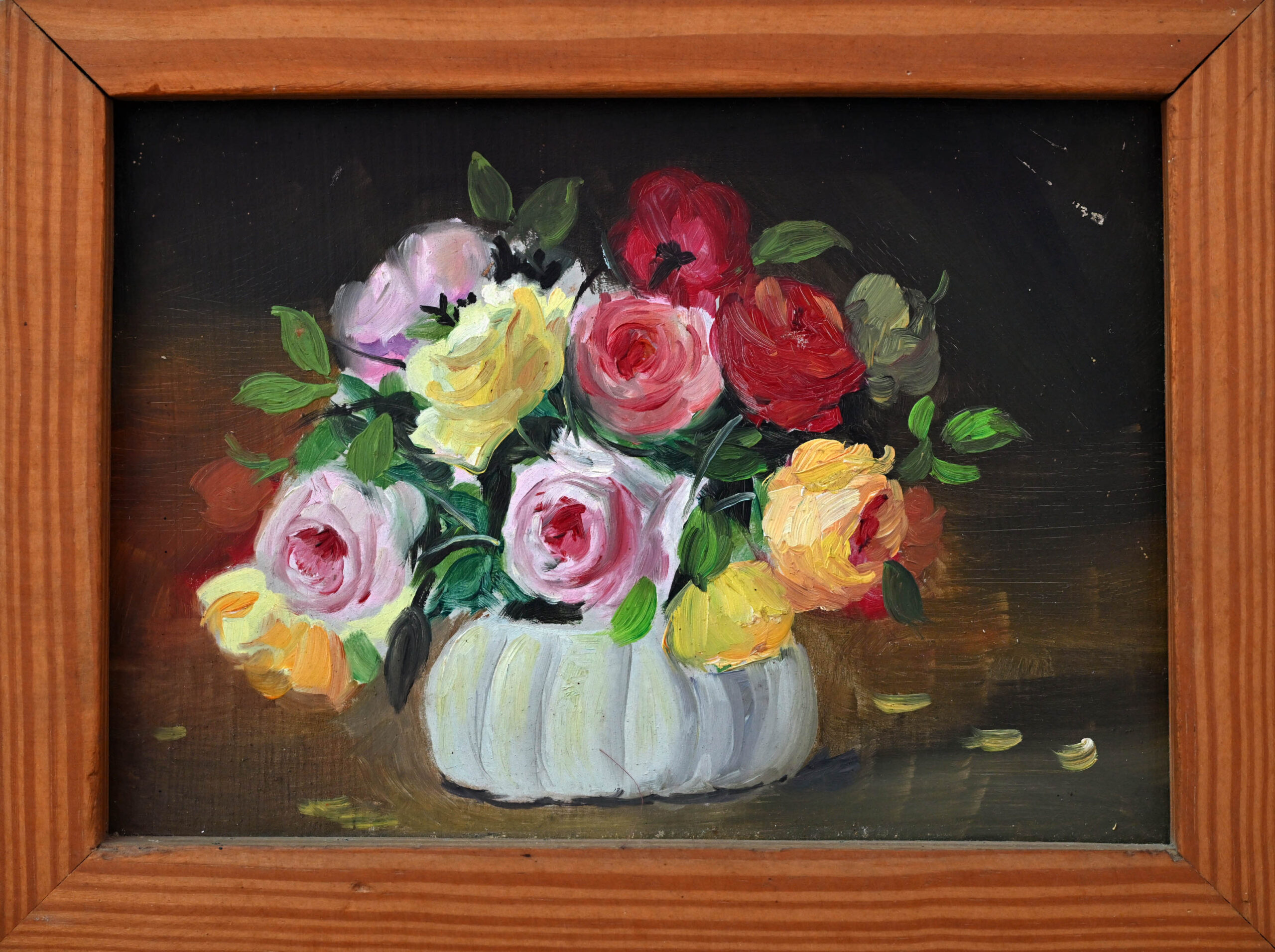 A bouquet of roses bursts from a white vase, each bloom painted with tender attention to color and form. Red, pink, yellow, and white petals glow against a dark background, their vibrancy heightened by contrast. The composition is classic yet emotive, celebrating nature’s elegance through soft brushwork and balanced arrangement. This still life whispers of beauty preserved—fleeting, fragrant, and timeless.