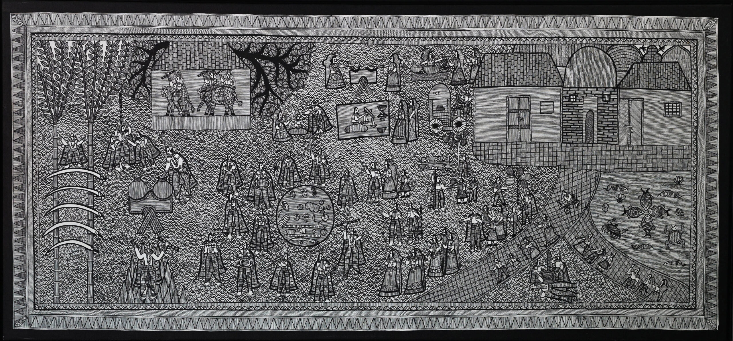 A bustling village scene unfolds in intricate black-and-white lines, where every figure, tree, and building pulses with rhythmic detail. Rituals, music, farming, and bathing converge in a tapestry of daily life, woven through the symbolic lens of Madhubani tradition. Circular motifs and flowing rivers echo cycles of community and nature, grounding the artwork in cultural…