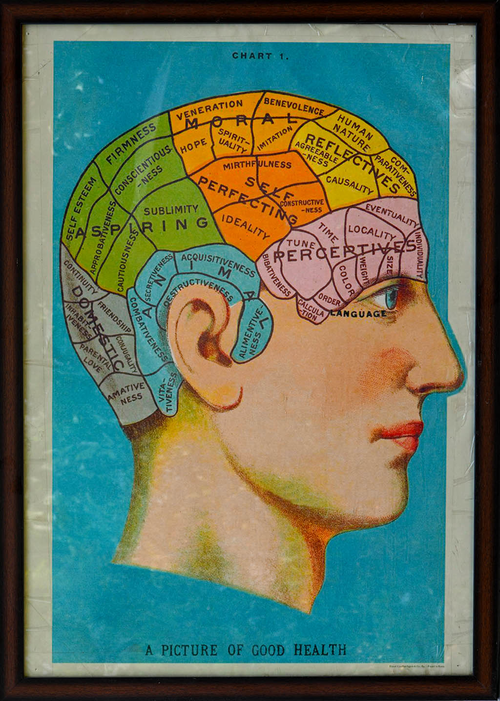A vintage profile of the human head unfolds like a map of the mind, each colored segment claiming dominion over a trait—hope, combativeness, sublimity. Styled in the language of phrenology, this chart masquerades as science while revealing the era’s yearning to decode character through cranial cartography. “A Picture of Good Health” reads ironically beneath a…