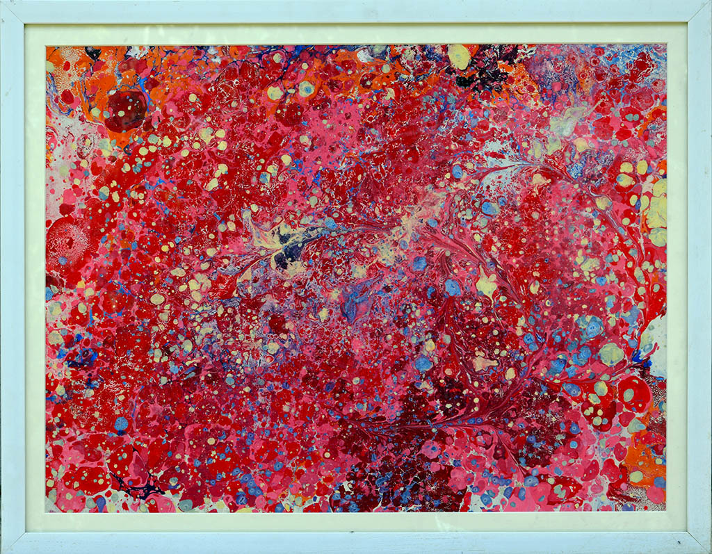 This artwork erupts in a cascade of red, splashed with yellow, blue, pink, and black—like emotion spilled across a canvas. The marbling technique creates a fluid, almost volcanic texture, where chaos and beauty swirl together. Each speckle and streak feels spontaneous, yet strangely harmonious, as if the painting breathes with its own rhythm. Framed in white, the intensity is held like a secret—wild, vivid, and alive.