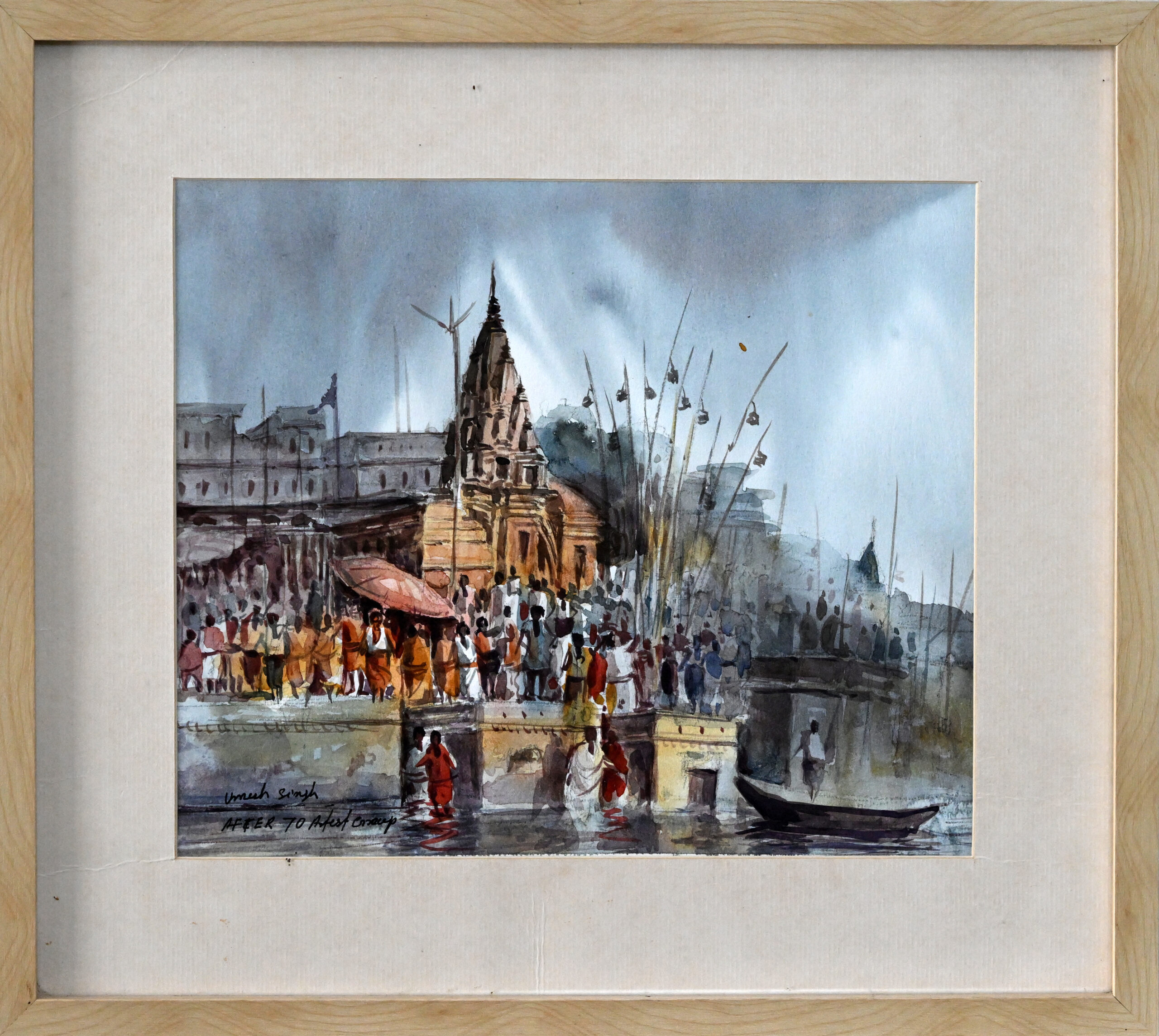 Vasudeo Kamath’s ink drawing unfolds like a visual meditation, where a stylized face emerges from the earth, entwined with birds and reaching hands. The elongated features and sparse lines evoke introspection, while the birds in flight suggest liberation, thought, and spiritual ascent. Each gesture and contour feels symbolic, bridging the human and the elemental in quiet harmony. It’s a contemplative composition—where stillness meets motion, and the soul communes with sky.