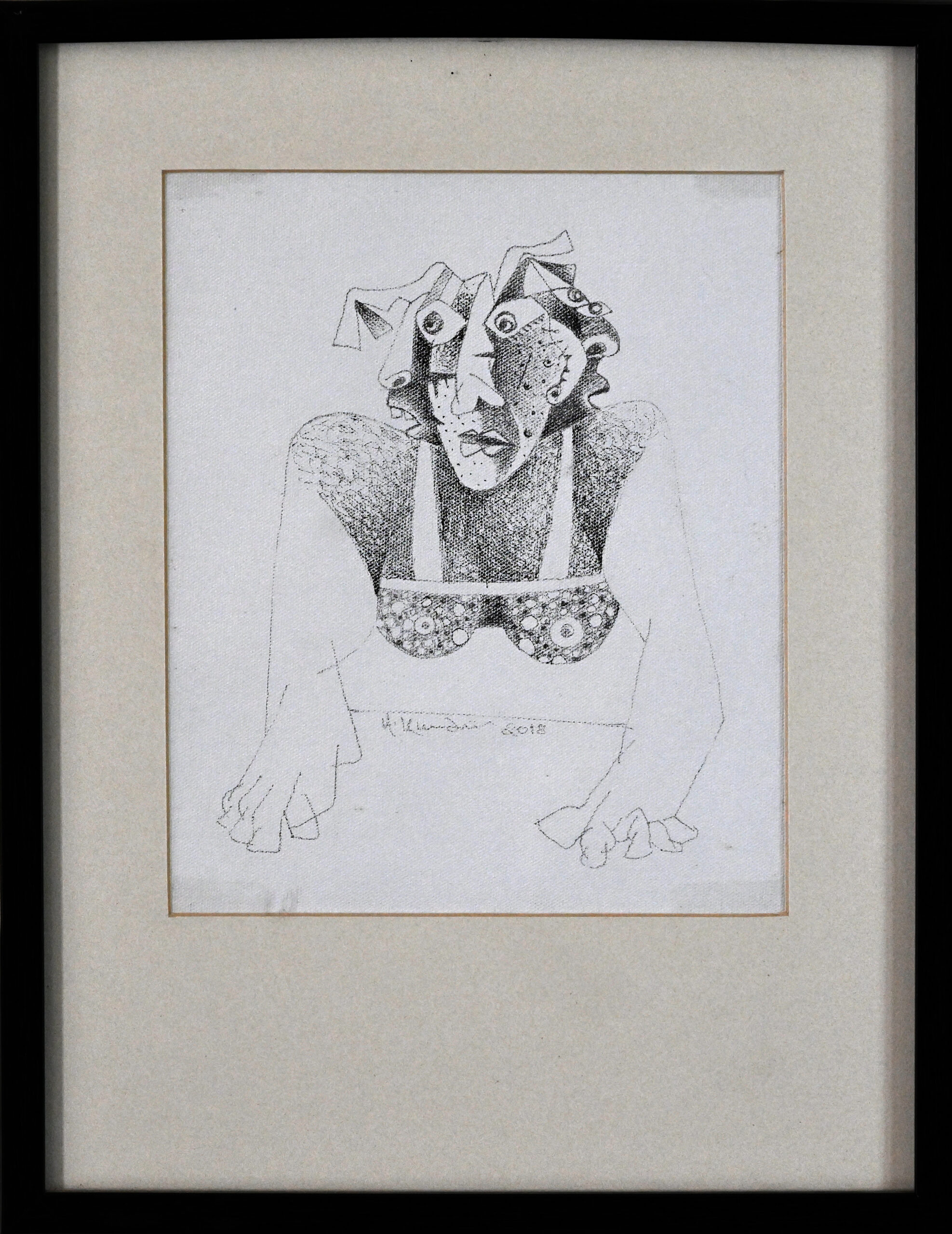 Vasudeo Kamath’s ink drawing unfolds like a visual meditation, where a stylized face emerges from the earth, entwined with birds and reaching hands. The elongated features and sparse lines evoke introspection, while the birds in flight suggest liberation, thought, and spiritual ascent. Each gesture and contour feels symbolic, bridging the human and the elemental in quiet harmony. It’s a contemplative composition—where stillness meets motion, and the soul communes with sky.