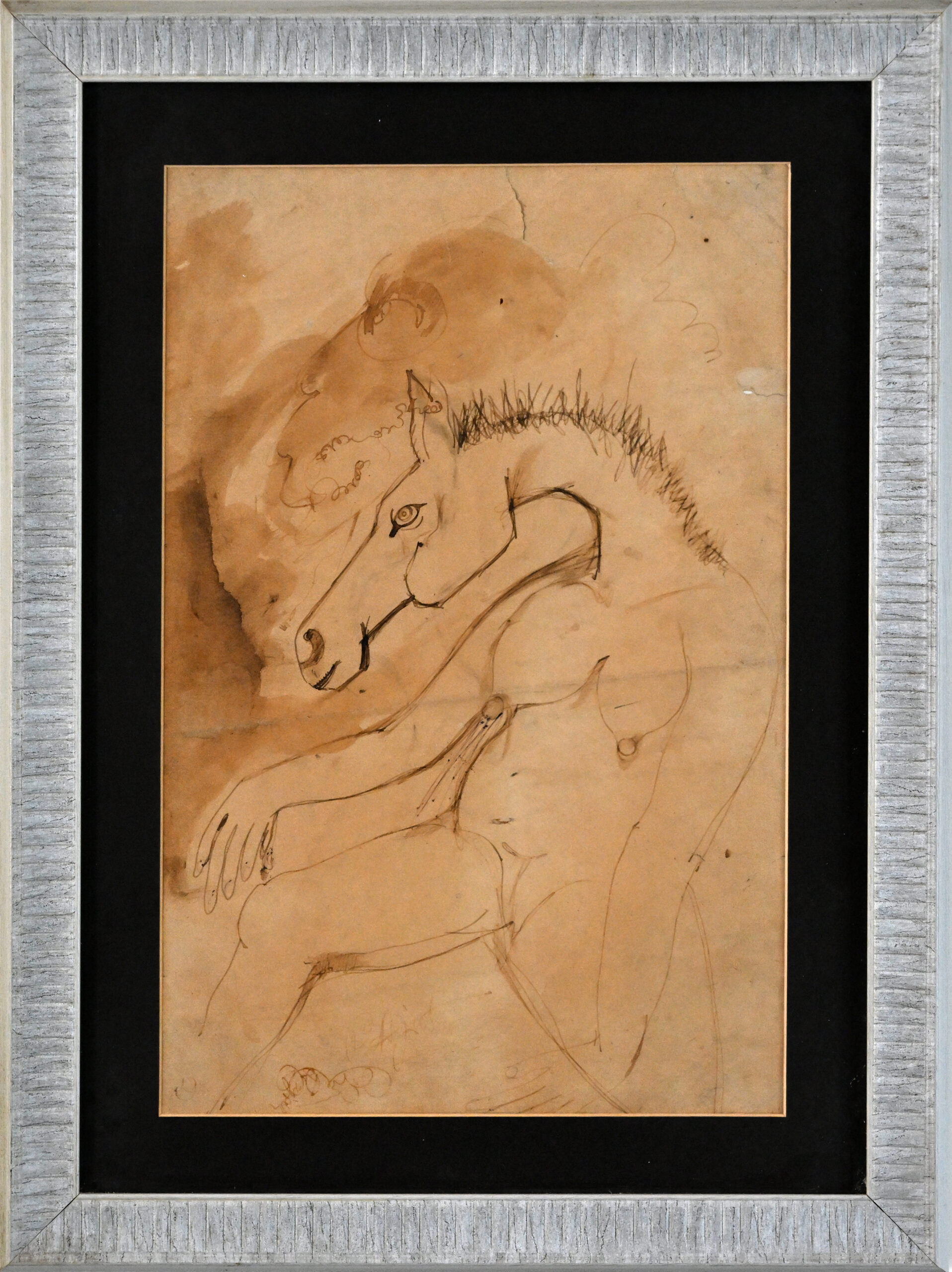 Vasudeo Kamath’s ink drawing unfolds like a visual meditation, where a stylized face emerges from the earth, entwined with birds and reaching hands. The elongated features and sparse lines evoke introspection, while the birds in flight suggest liberation, thought, and spiritual ascent. Each gesture and contour feels symbolic, bridging the human and the elemental in quiet harmony. It’s a contemplative composition—where stillness meets motion, and the soul communes with sky.