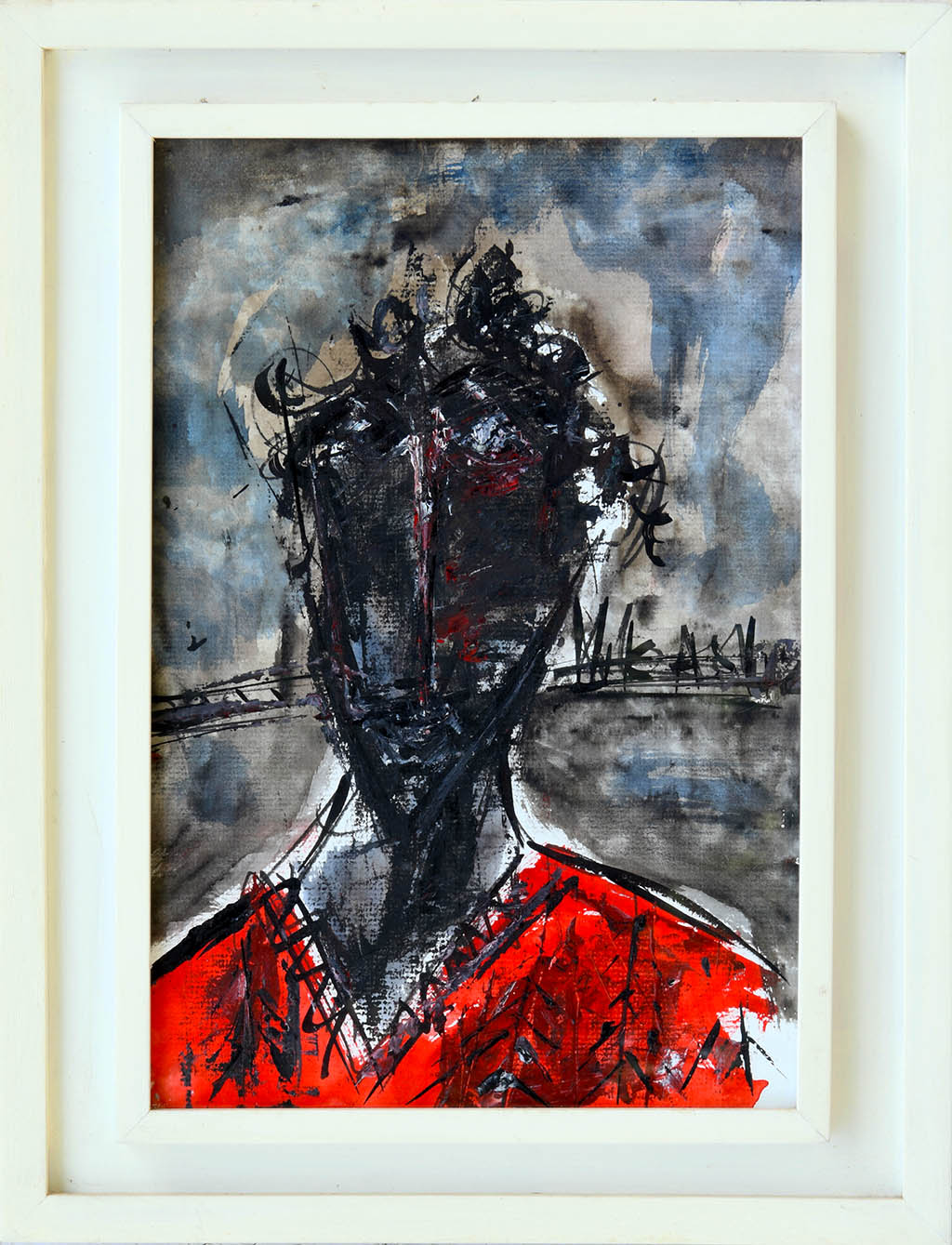 This haunting portrait by Vikas Kalra merges abstraction with emotional depth, presenting a solitary figure cloaked in a vivid red garment. The face, rendered in dark, indistinct strokes, evokes anonymity and introspection, while the curly hair adds a touch of raw humanity. Behind the figure, a moody sky and shadowy landscape suggest inner turmoil or existential drift. Kalra’s expressive brushwork and stark contrasts invite reflection on identity, solitude, and the silent weight of memory.