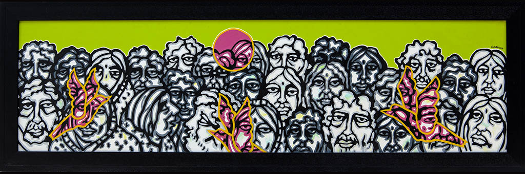Vivek Santra’s artwork teems with monochrome faces—each distinct, each anonymous—pressed into a lime-green field like a crowd caught mid-thought. Amid this dense human tapestry, three vivid butterflies flutter defiantly in pink and yellow, symbols of transformation or fleeting grace. A circular pink motif near the top, containing twin stylized faces, adds a surreal echo, as if memory or myth hovers above the collective. The piece vibrates with tension between conformity and emergence, where individuality flickers against the backdrop of mass identity.