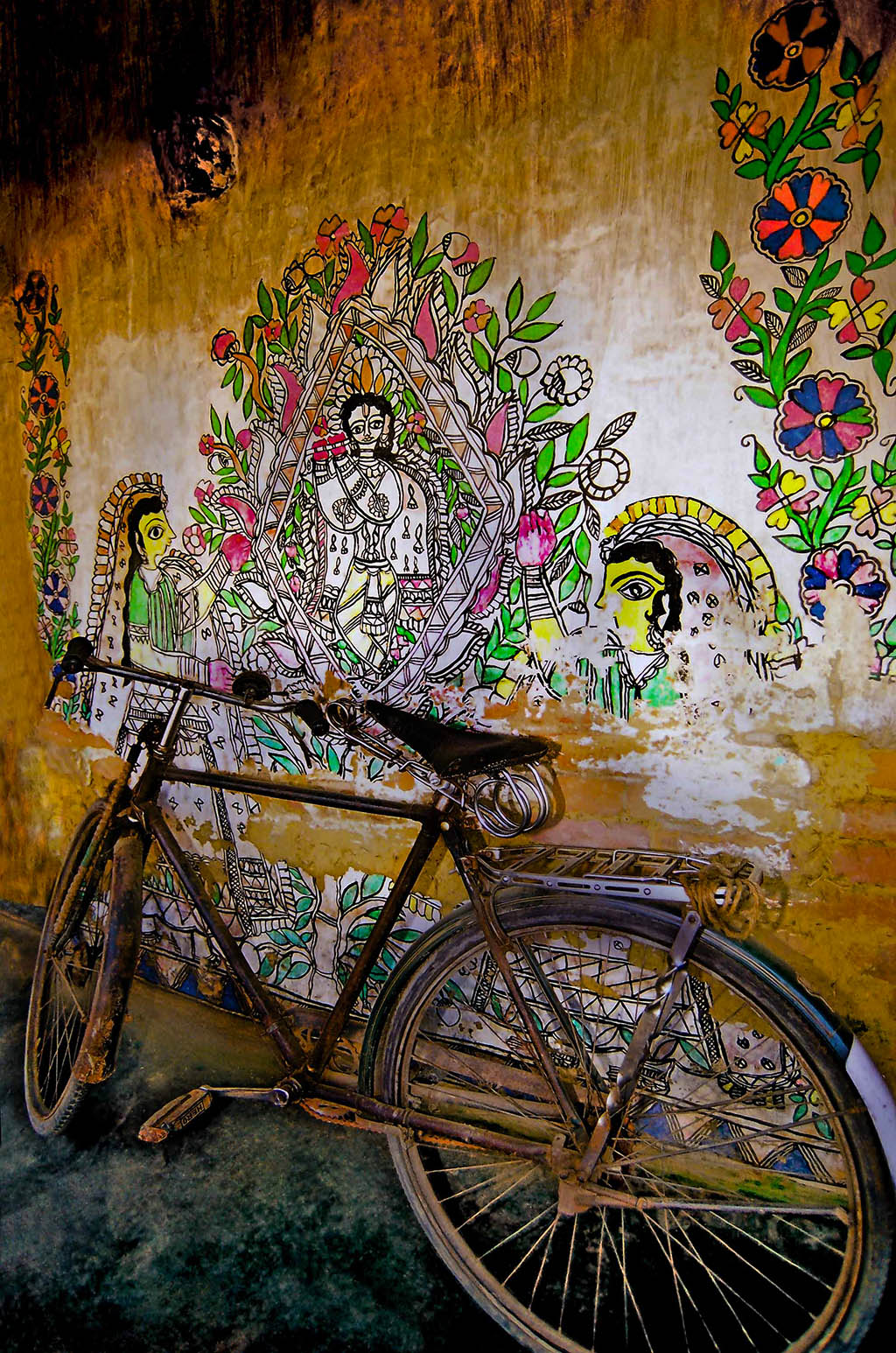 An old bicycle leans gently against a mural-rich wall, where vibrant folk art bursts with life and tradition. The painted figures, framed in floral motifs, evoke stories of culture and devotion across a weathered canvas. The juxtaposition of rustic metal and radiant color creates a timeless dialogue between utility and art. Photographed by Shailendra Kumar,…