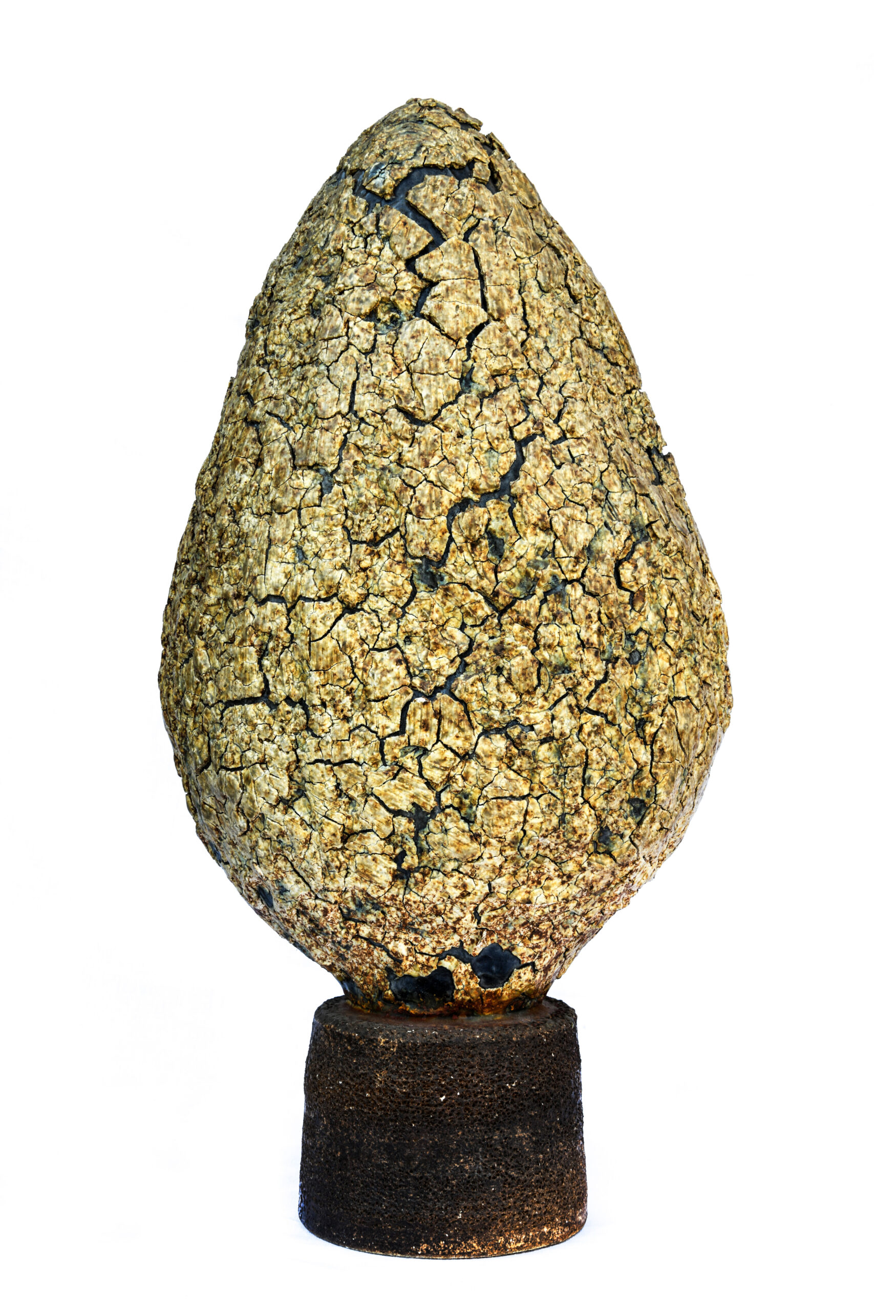 Cracked like the memory of earth itself, this egg-shaped ceramic form by Brahmadeo Pandit evokes primordial tension—fragility held within strength. Its mottled surface, etched with fissures and burnished hues, suggests geological time, as if fire and clay conspired to birth a relic of both origin and aftermath. Mounted on a dark cylindrical base, the sculpture rises with quiet authority, a vessel of silence and rupture. Pandit’s mastery lies in transforming abstraction into myth—where texture becomes testimony, and form becomes meditation.