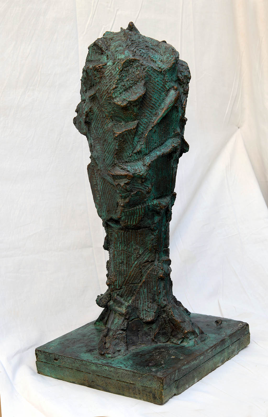 This bronze sculpture by Himmat Shah exemplifies his signature abstraction of the human head—an enduring motif in his oeuvre. Cast in a vertically elongated form, the head eschews anatomical realism in favor of a primal, textural presence. The surface is richly worked, bearing ridges, pockmarks, and fissures that evoke geological strata or ancient ruins, suggesting a dialogue between time, memory, and material. Mounted on a square base, the sculpture stands as a totemic figure—part relic, part witness—its organic irregularities resisting symmetry and inviting contemplation. Shah’s treatment of bronze here is both raw and reverent, transforming the medium into a vessel of existential inquiry and cultural resonance.